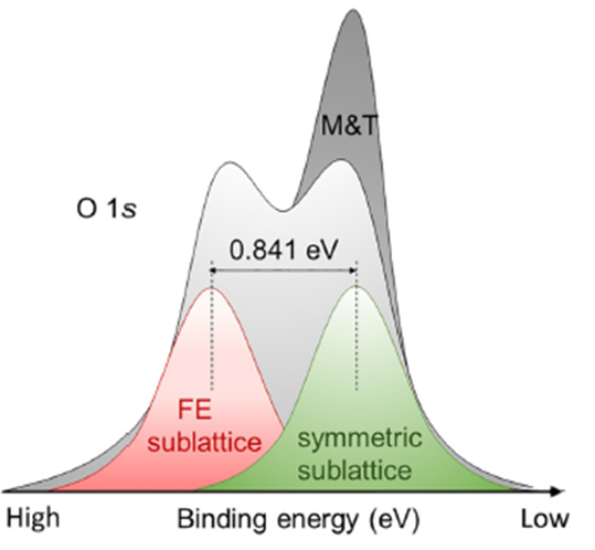 Figura 1. Spectrul O 1s evidențiază două componente distincte, asociate fazelor feroelectrice și nepolare din HfZrO₂ – o „amprentă” spectroscopică directă a feroelectricității la scară nanometrică. Imagine preluată din articolul Physical Review Materials, 2026, 10, 034401.