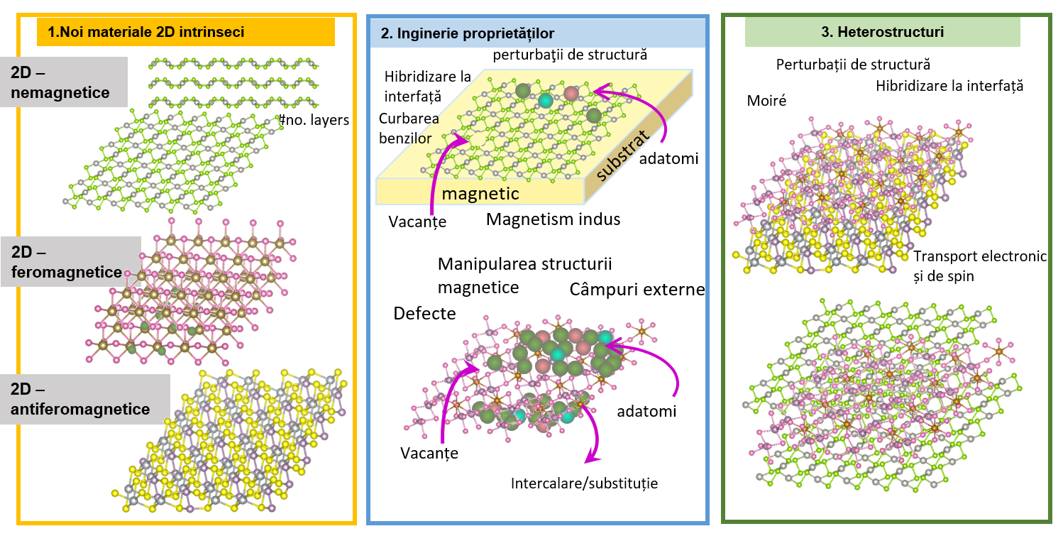 Electronica este în prezent printre cele mai solicitate tehnologii pentru dezvoltarea accelerată a lumii digitale. Nevoia sporită de funcționalități eficiente și multifuncționalități ale dispozitivelor electronice sporește interesul pentru noi materiale și sisteme care sunt ieftine, sustenabile și care pot funcționa cu un consum redus de energie și, în plus, sunt materiale reciclabile sau degradabile, pentru a reduce deșeurile electronice. Odată cu boom-ul grafenei, unele noi materiale 2D van der Waals îndeplinesc criteriile de mai sus și atrag atenția datorită unui spectru enorm pentru aplicații noi în electronică, fotonică, spintronică, stocare și comunicare sigură a informațiilor, cataliză, bioelectronică, senzori, stocarea și conversia energiei. În acest proiect, accentul este îndreptat pe dezvoltarea de strategii avansate de manipulare chimică și fizică a suprafețelor, cum ar fi adsorbția și/sau dopajul cu adatomi sau molecule organice, aplicarea de stimuli electrici, mecanici și magnetici locali pentru activarea și controlul structurii și proprietăților electronice, magnetice și spintronice aferente ale noilor materiale 2D și ale heterostructurilor hibride. Investigațiile vor urma calea controlului și performanței de la o abordare microscopică la nivel funcțional individual, cu rezoluție atomică și moleculară, la efecte de proximitate și comportament colectiv electronic, magnetic și de transport de spin în straturi 2D individuale, multistrat, hibride și/sau intercalate.